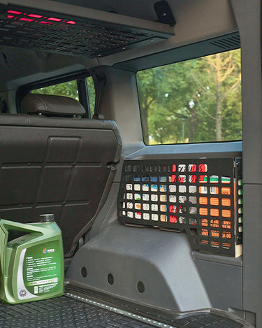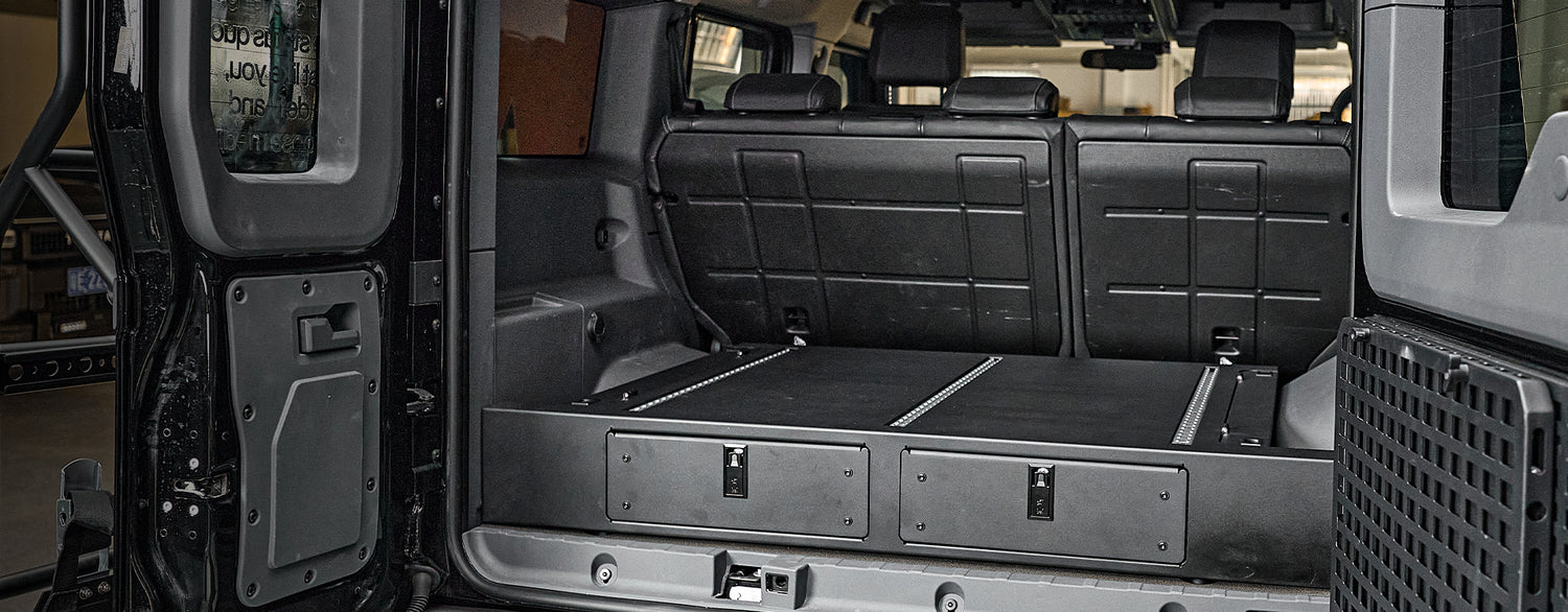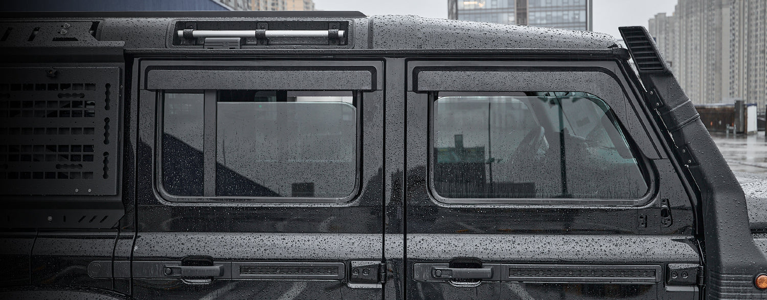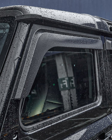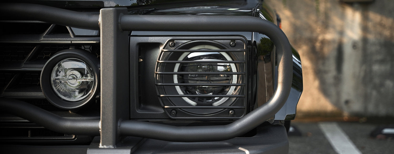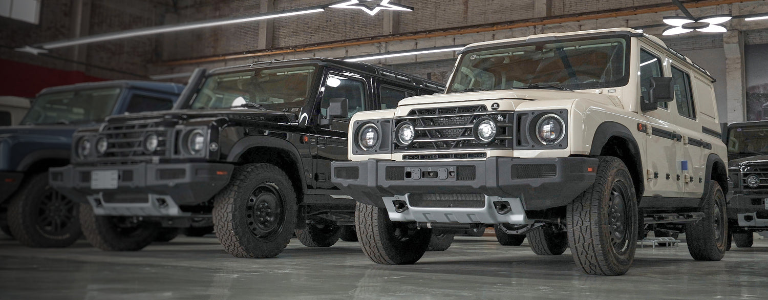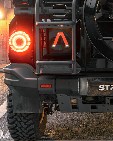 The premium Electric Side Steps for your 2023-2025 Ineos Grenadier automatically deploy when doors are opened, showcasing LED light strips and a robust black finish that combines rugged elegance with practical functionality.