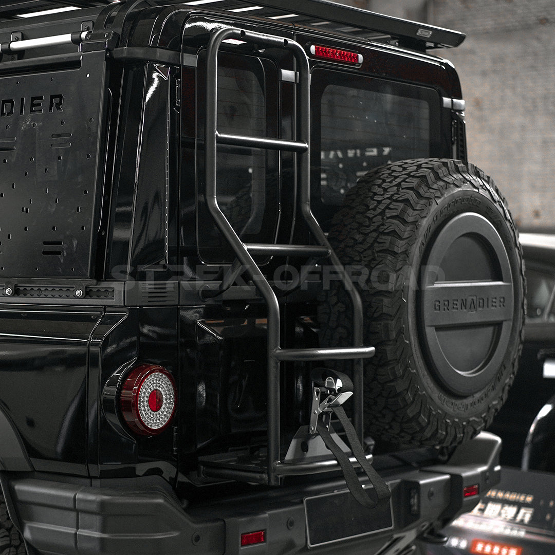 Equip your 2023+ INEOS Grenadier for serious overlanding with the robust Aluminum Car Rear Trunk Rack and Tail Door Ladder from STREK OFF ROAD. This integrated system provides safe, easy access to your roof rack while adding a functional cargo platform right on the rear door. Built tough with high-quality aluminum, this ladder mimics the rugged exterior of the Grenadier and is designed for maximum durability and utility.